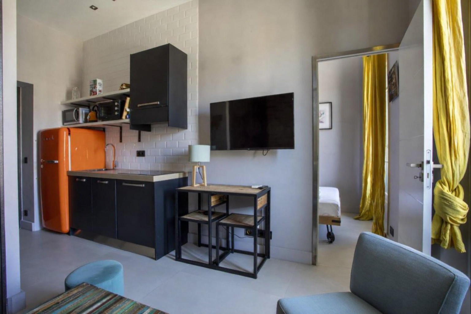 This apartment consists in a bedroom with a comfortable double bed (Queen size, retractable and 80 cm away from the floor in night position), bathroom with shower, kitchen open on the living room..