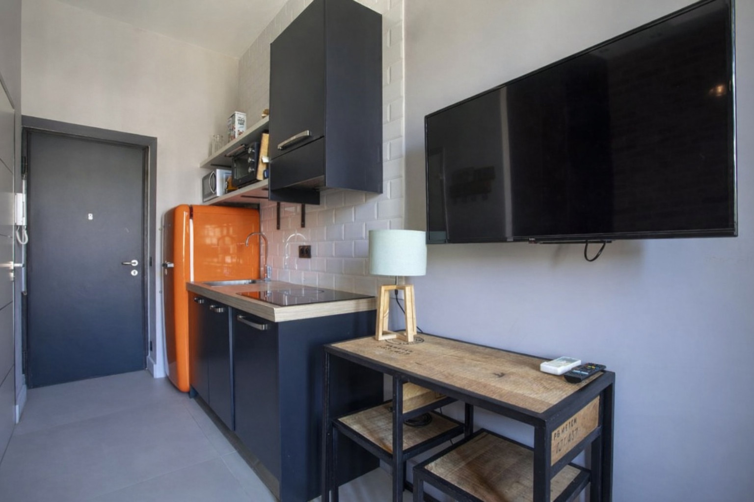 This apartment consists in a bedroom open on the living room with a double bed and closet, bathroom with shower and WC, kitchen open on the living room with a sofa and TV.