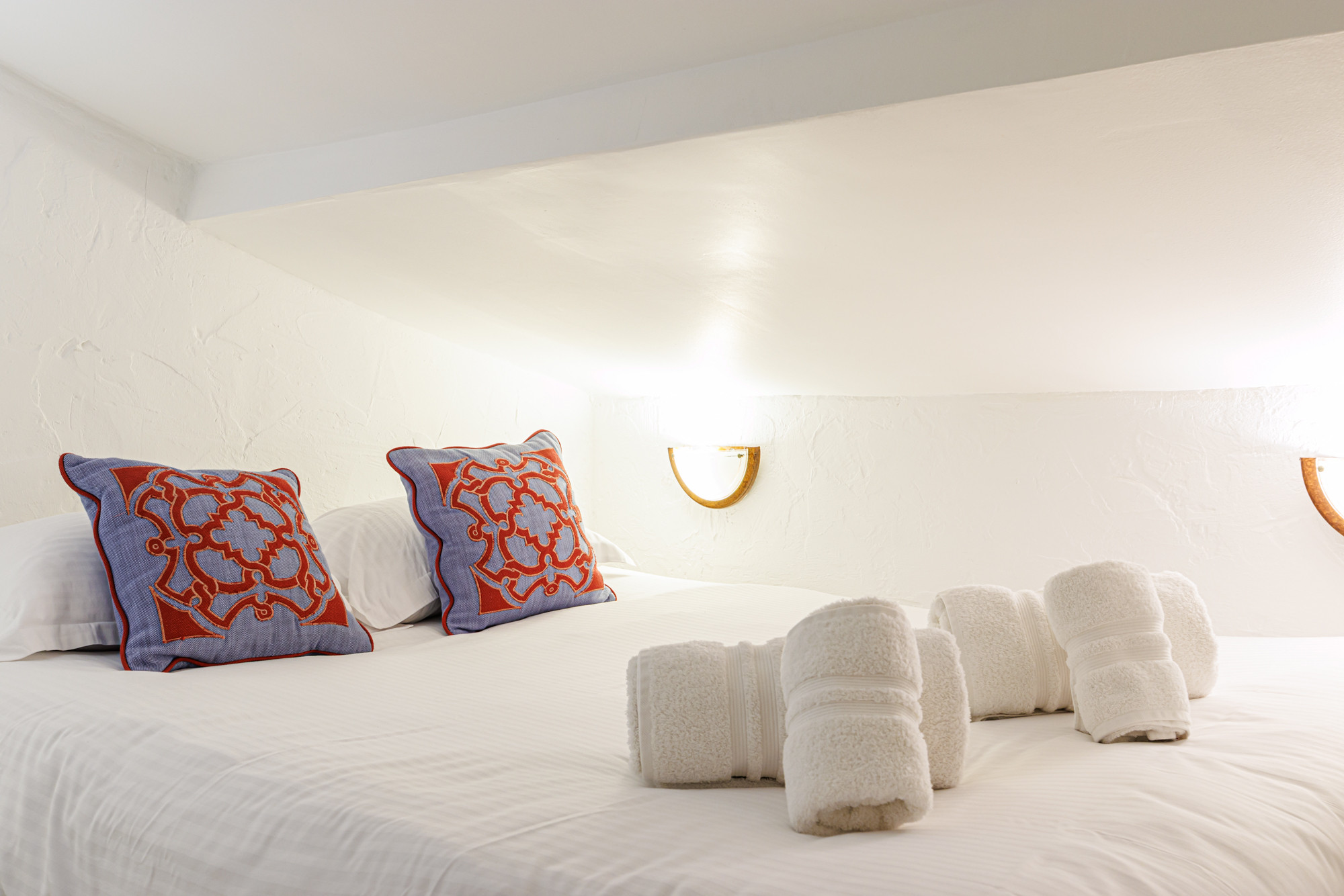 The three bedrooms have comfortable 160cm double beds and are arranged as follows: a large bedroom with an ensuite bathroom, a smaller bedroom, and a third bedroom upstairs, at the top of the building under the eaves.