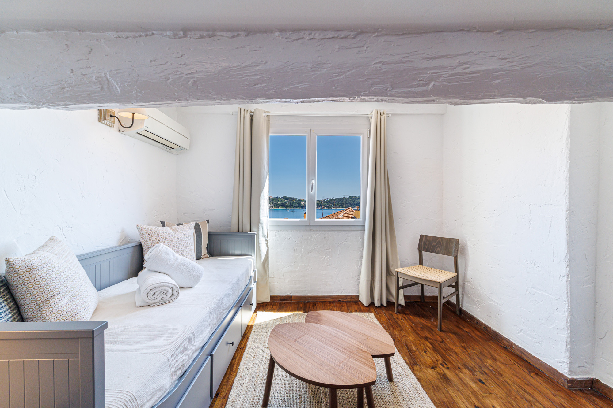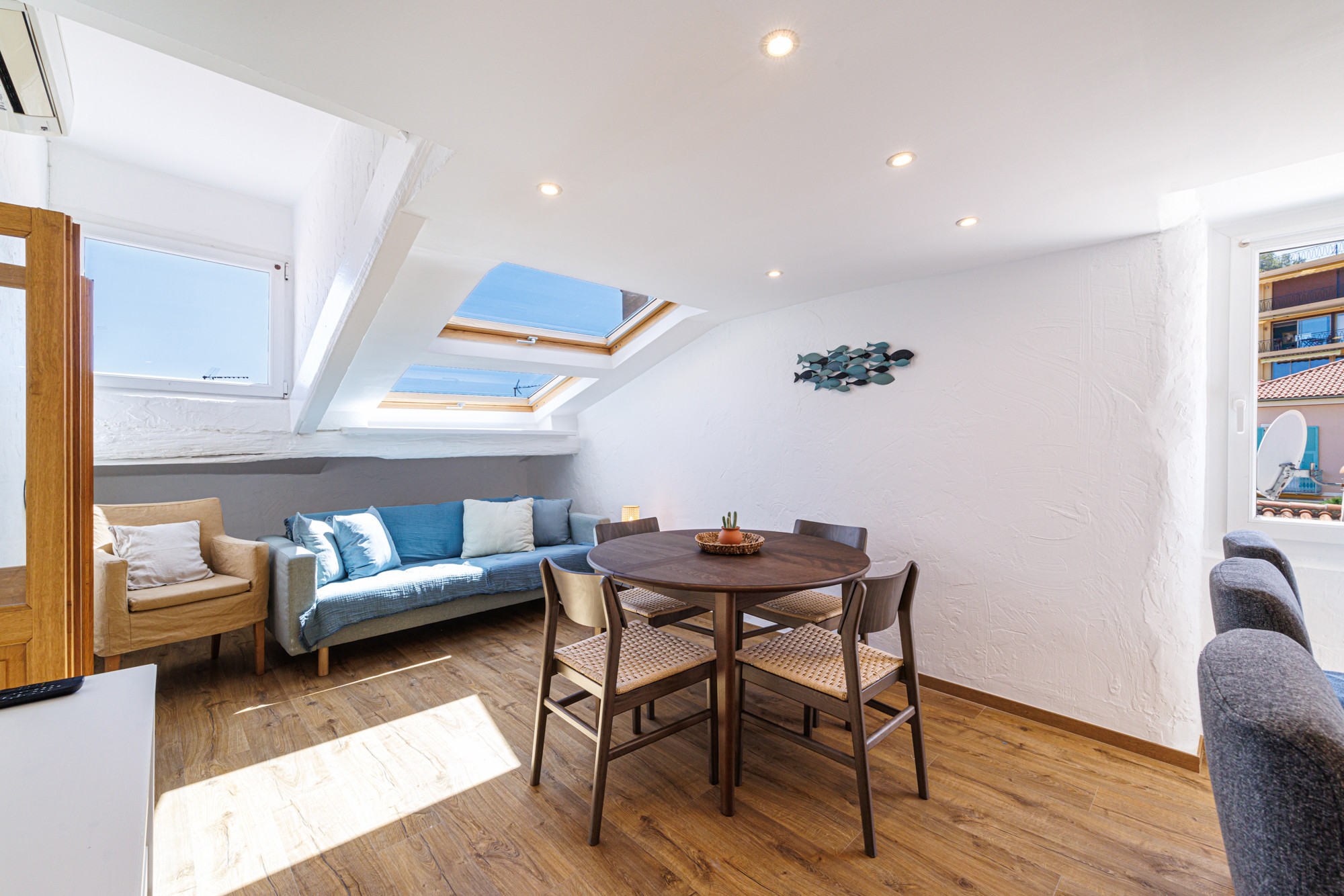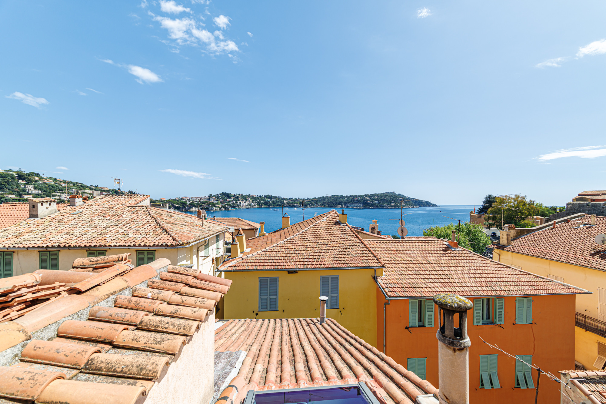 Unique 3 bedroom apartment with views over the village rooftops and the sea. Beaches, restaurants, bars, cafes, and shops are right at the foot of the building. 5 km from the center of Nice and close to public transport.