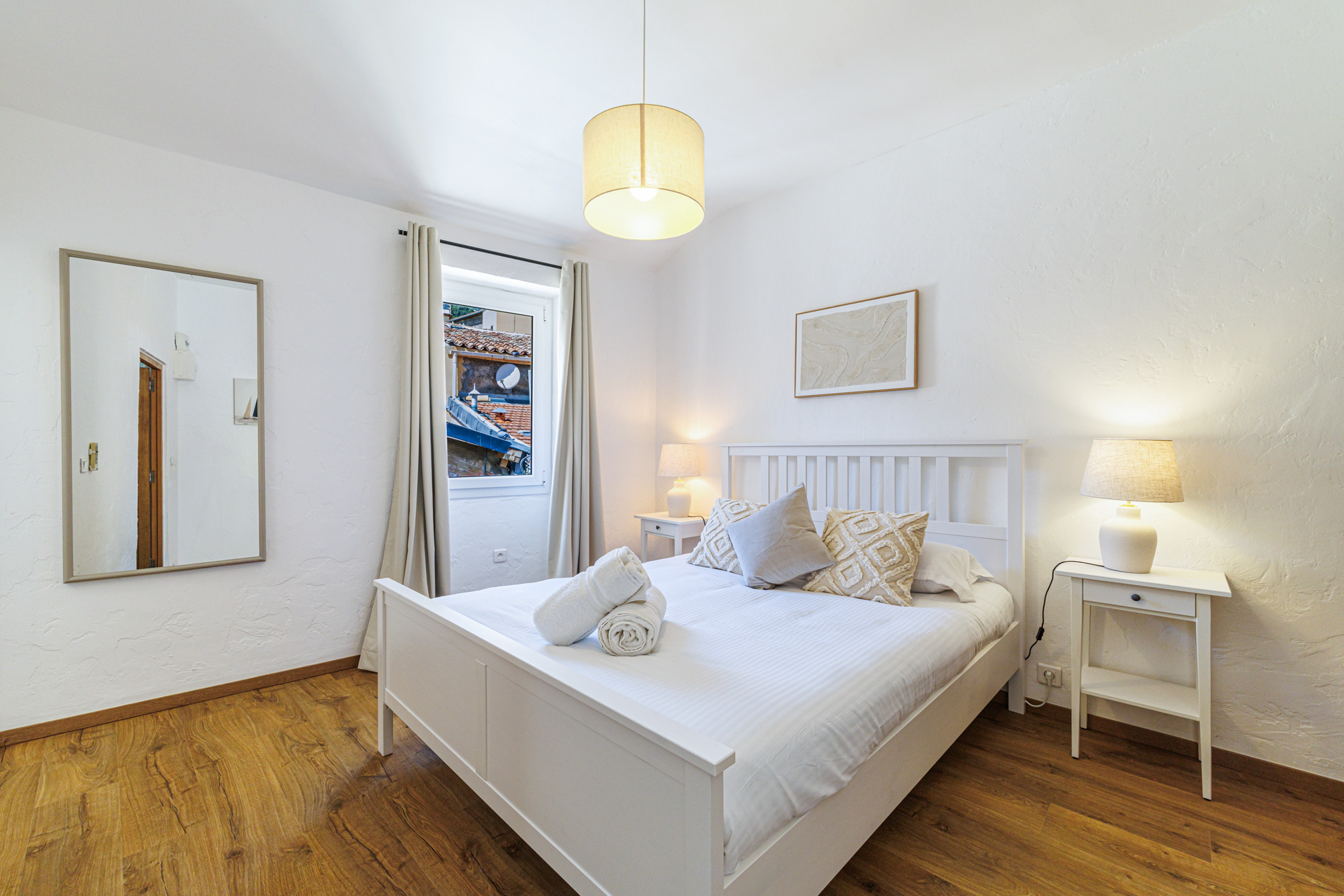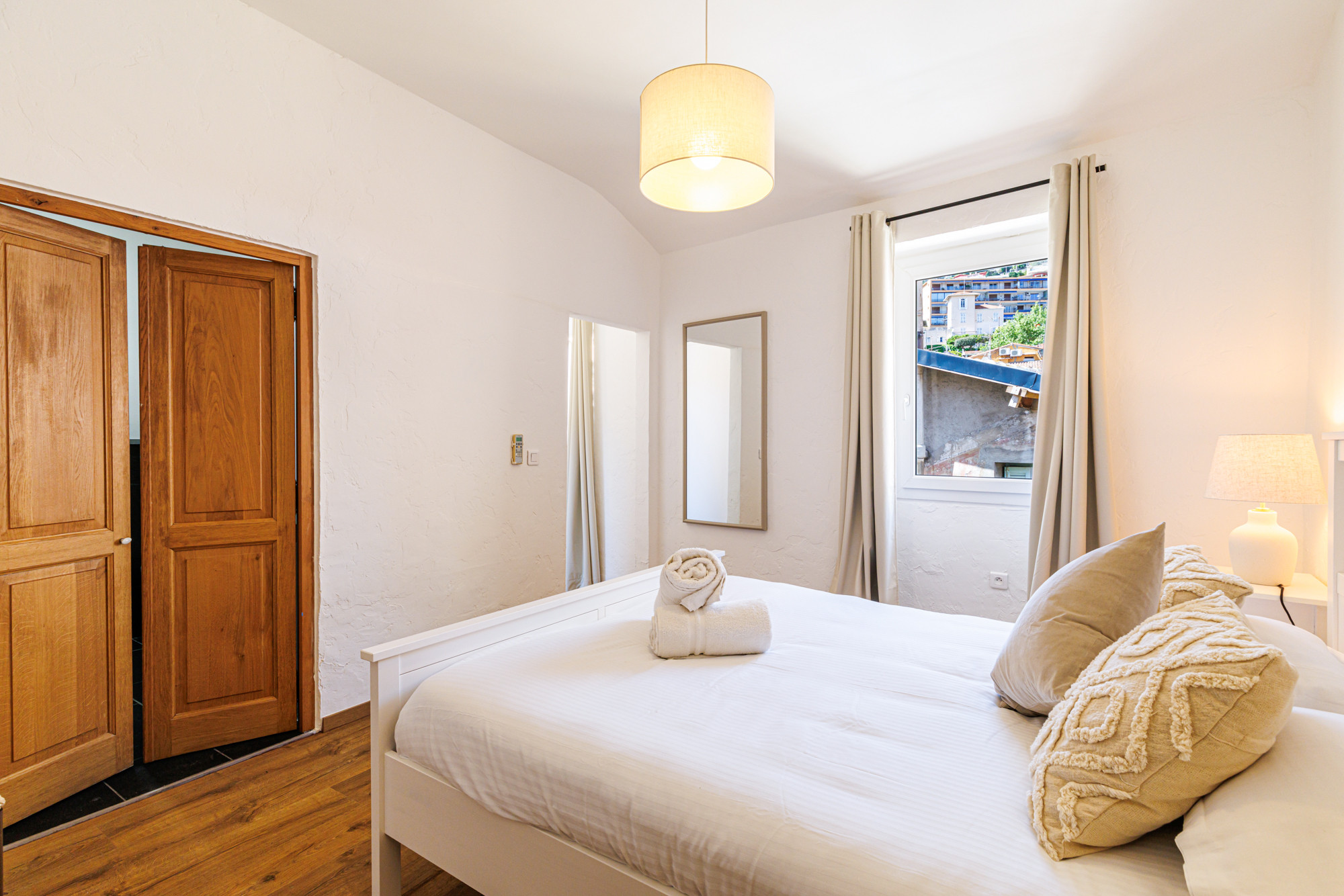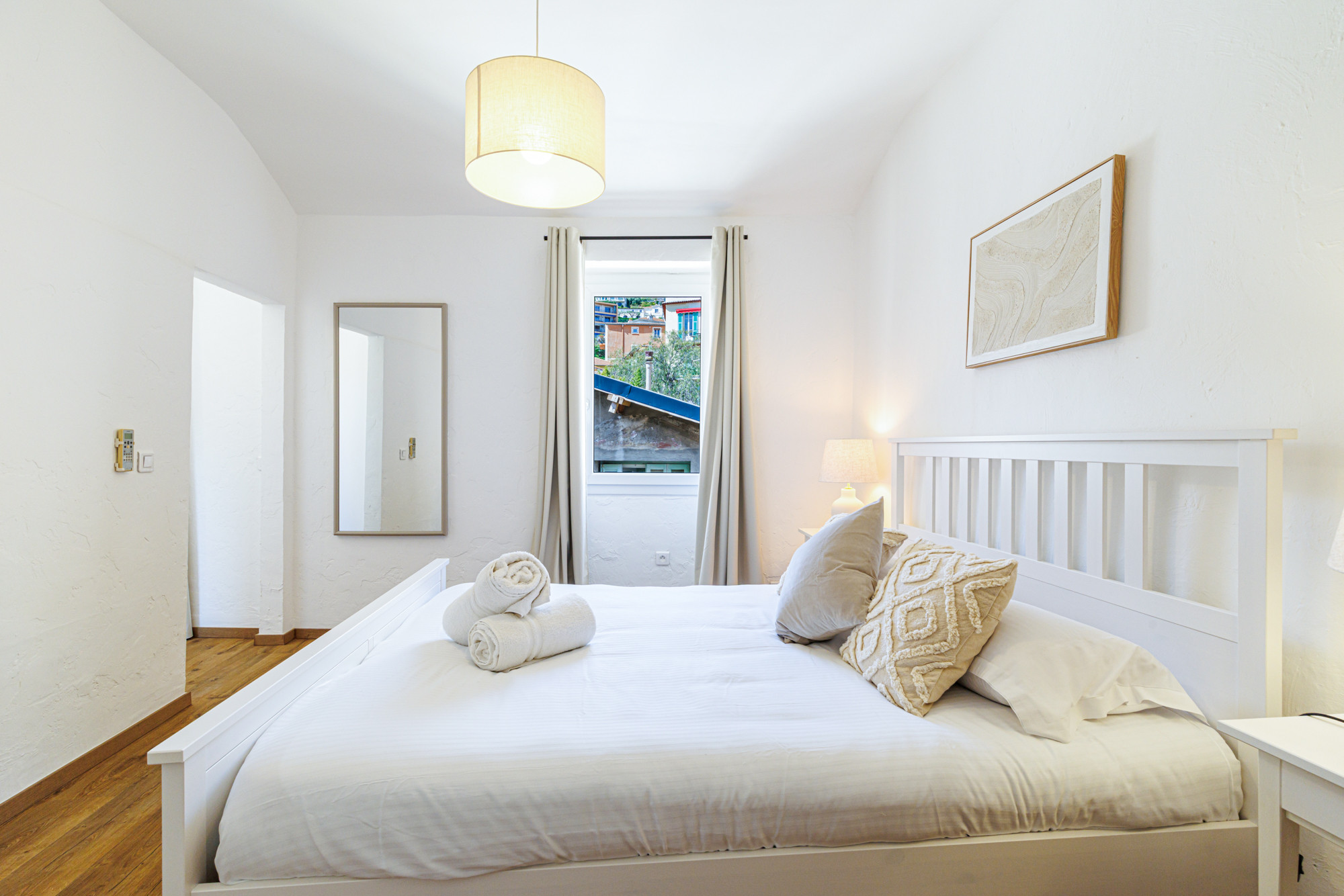 Unique 3 bedroom apartment with views over the village rooftops and the sea. Beaches, restaurants, bars, cafes, and shops are right at the foot of the building. 5 km from the center of Nice and close to public transport.