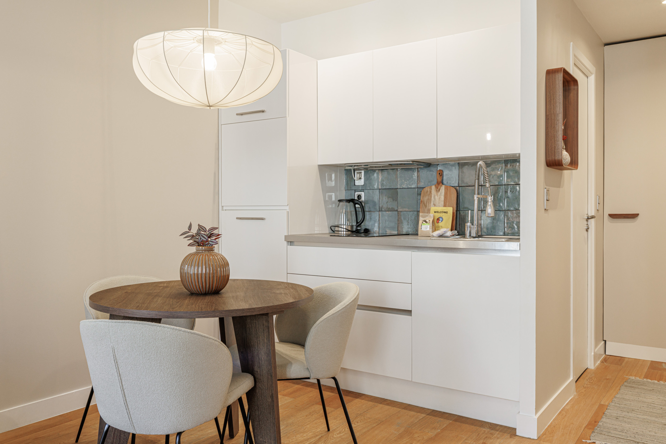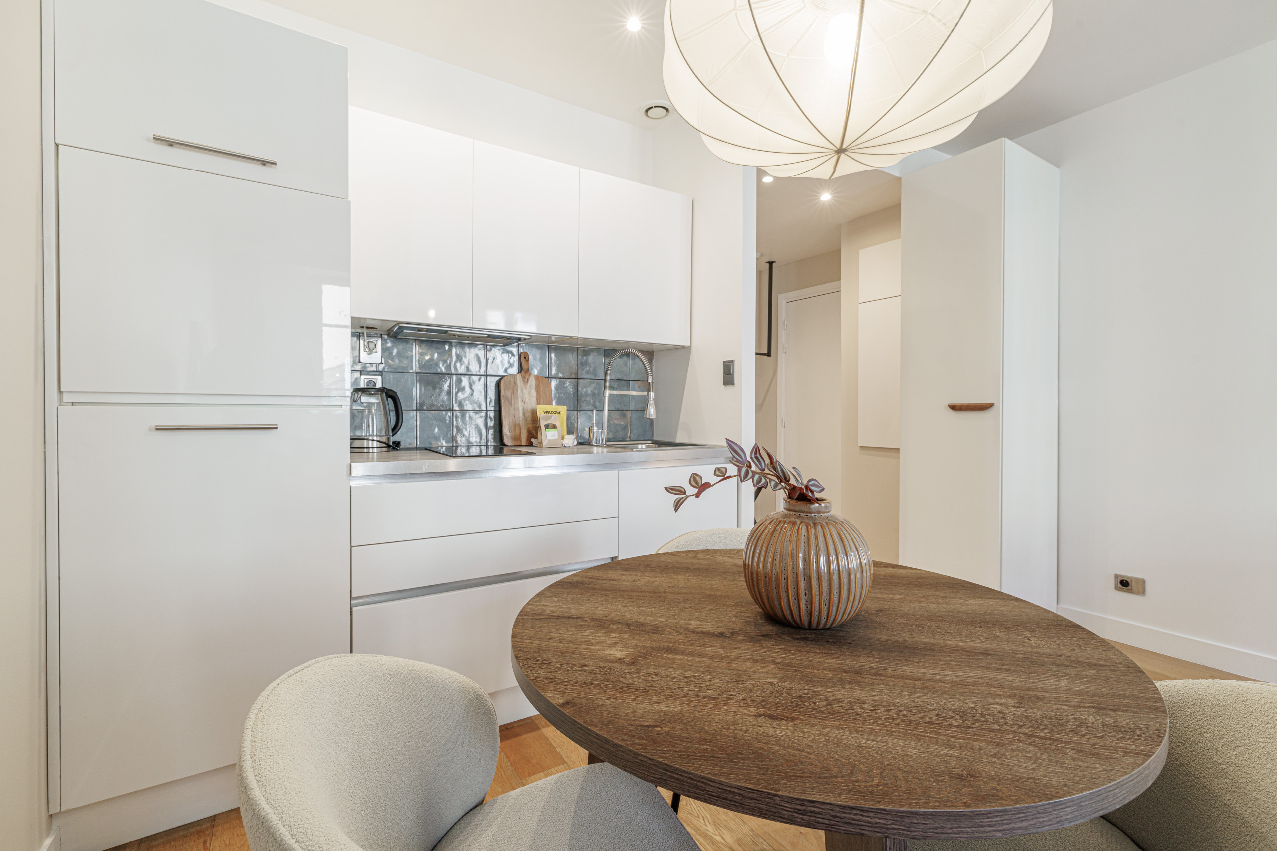 The kitchen is fully equipped with a refrigerator, hotplates, washing machine, microwave, Nespresso machine, and kettle.