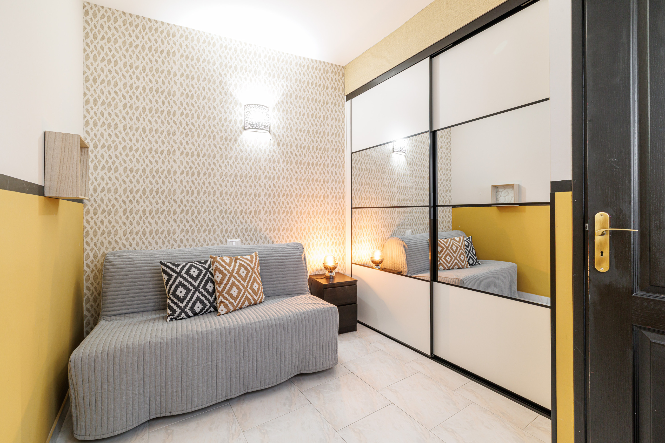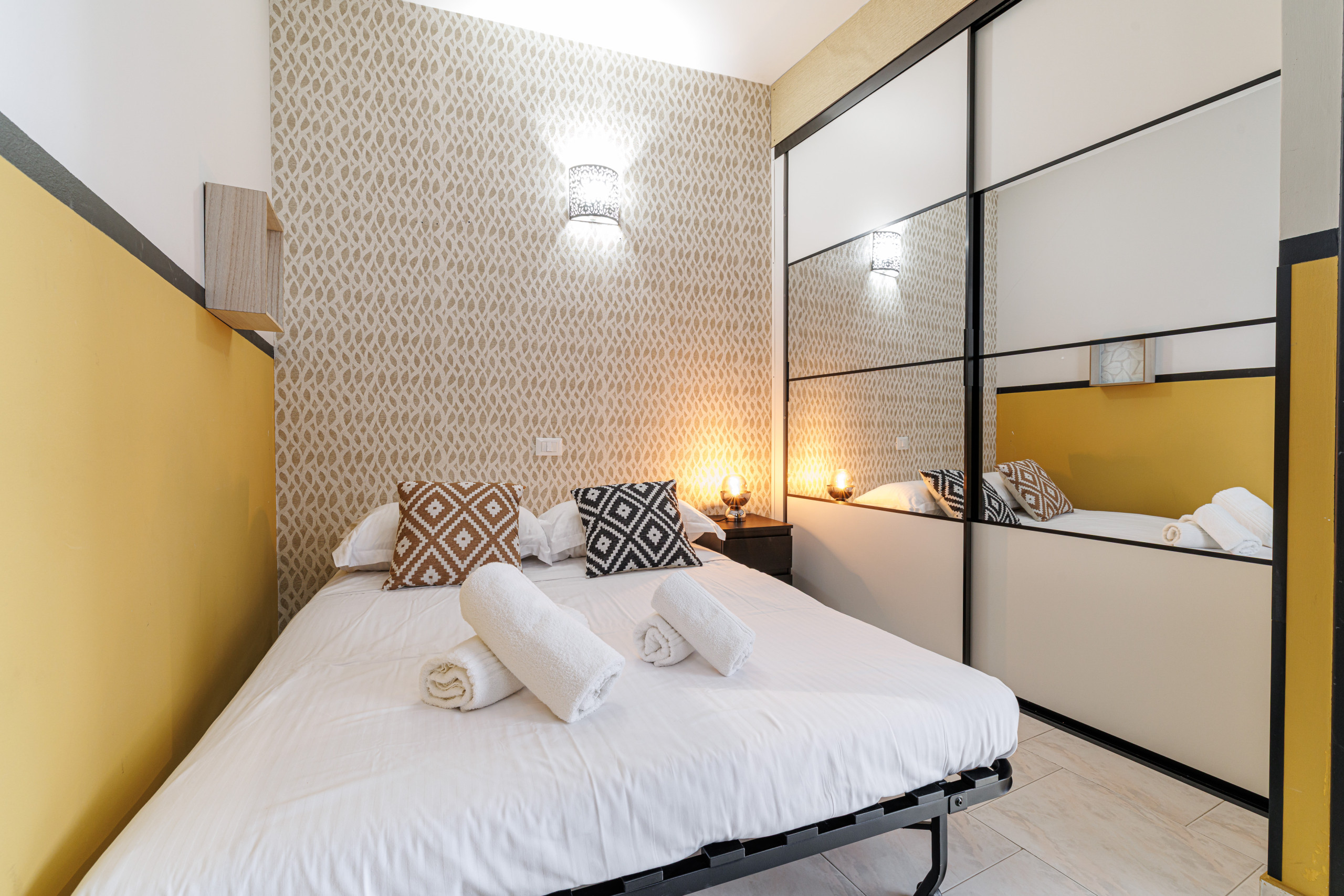 Le logement est composé d'une chambre avec un lit double confortable et d’un accès au balcon côté cour, une salle de bain avec douche et WC, une cuisine ouverte sur le salon salle à manger avec canapé-lit et télévision. Il y a également un accès au balcon dans le salon. Dans la chambre principale vous trouverez également un ventilateur au plafond, très utile pendant l'été.