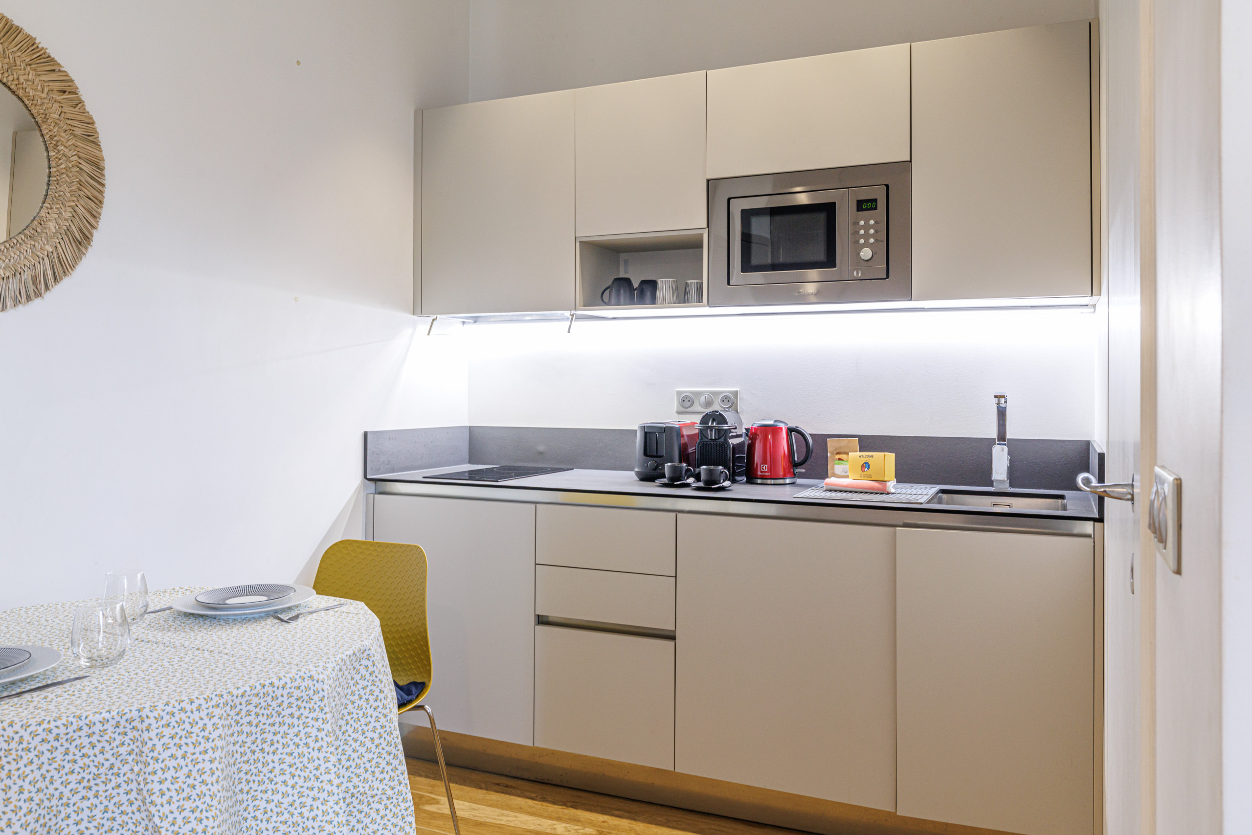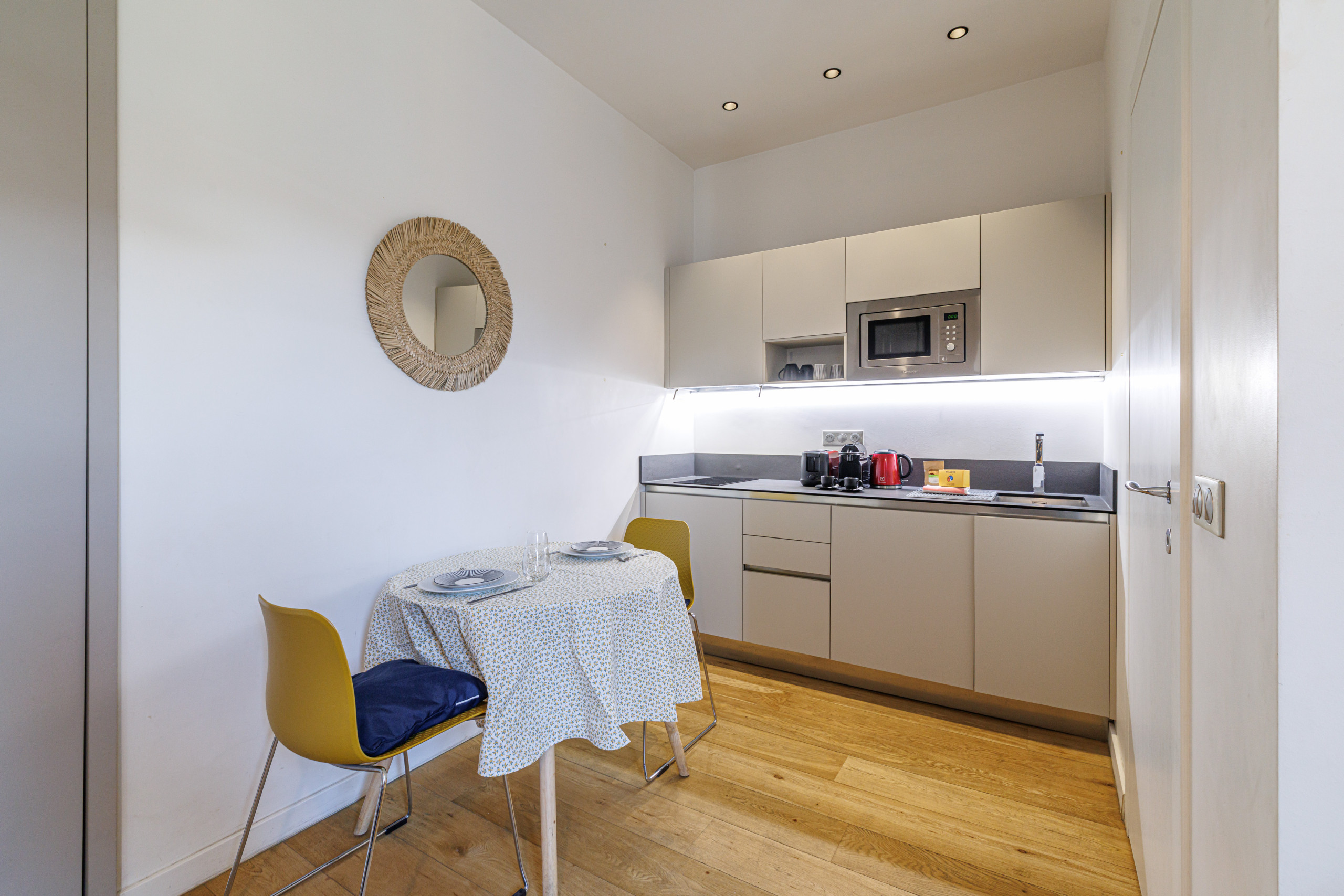 La cuisine est tout équipée avec réfrigérateur, plaques de cuisson, machine à laver, micro-ondes, machine à café Nespresso, bouilloire.